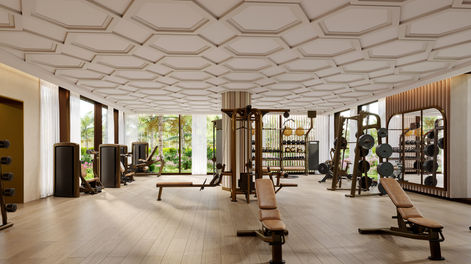 The design of the Spa & Fitness Center for the Amaala Four Seasons Resort includes a fully equipped male & female spa with indoor & outdoor relaxation areas, treatment rooms, large indoor wet rooms with Saunas, Steam Rooms, Cold Plunge Pools & Vitality Pools. Accessed via the large open-to-air circular arrival area, filled with lush landscaping and a central water feature with a rain curtain, the facility also includes a fitness center with open and private training rooms, a gym, and a virtual spa. The central dome lies on an axis from the main resort entrance toward Hijaz Bay, overlooking a dry wadi, now a pedestrian park.